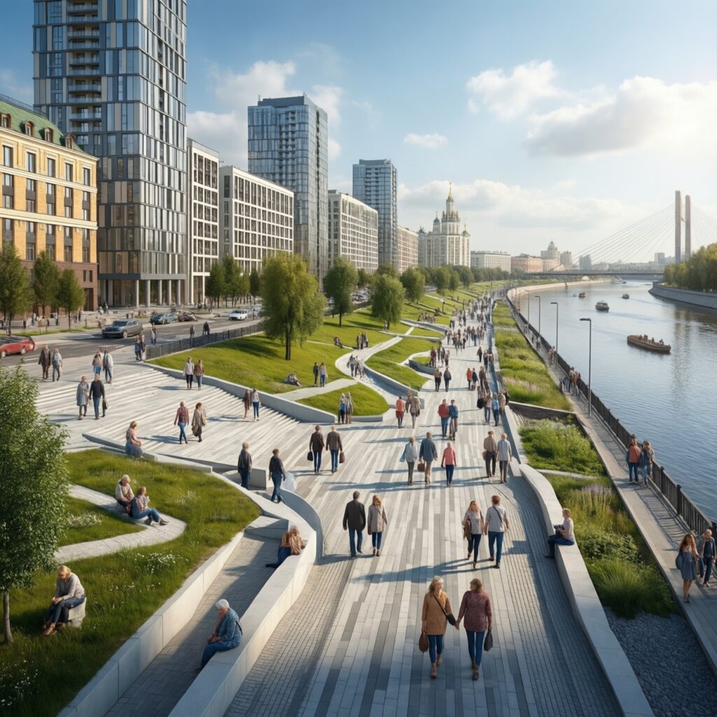 Современные российские города обновляют общественные пространства и набережные через понятный цикл: диагностика, цели, проект, пилот,...